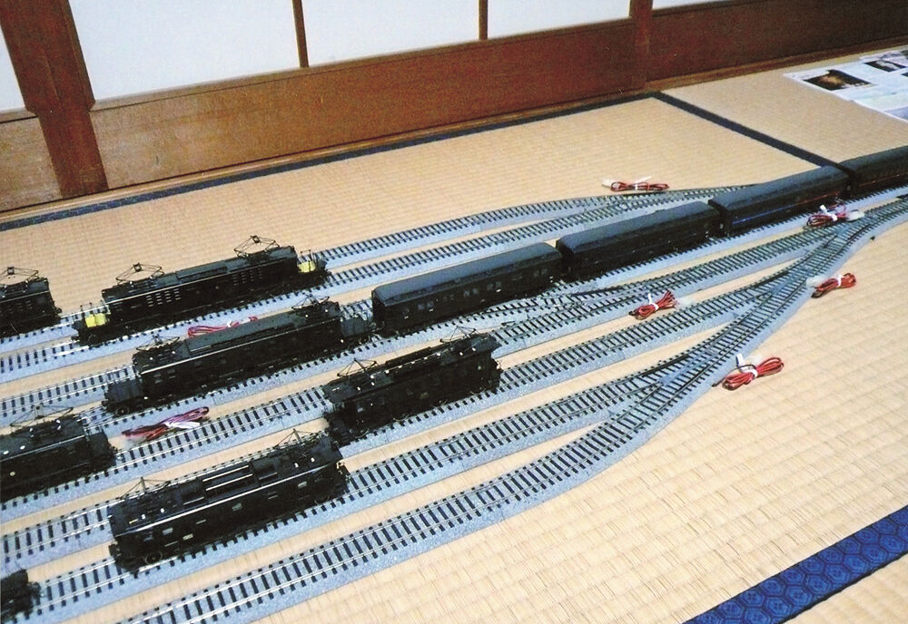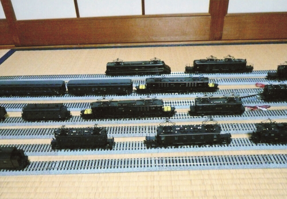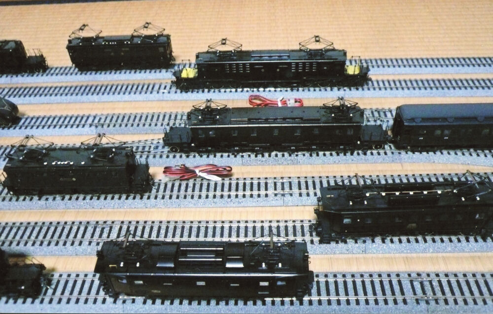 鉄道模型を始めた当初は当時の最新車輛やブルートレインが興味の中心で,旧型電気機関車には興味がなかったのですが1976年の鉄道模型趣味誌のピノチオ社の広告でEF50の組立て見本の模型を見て圧倒されました.そして追い打ちをかけるように1980年に刊行された世界の鉄道別冊「世界の鉄道模型」(朝日新聞社発行)で,故・原信太朗氏が所有する千代田計器製のEF50やオハ31(写真は一部分でしたが)を見て,その重厚さに惹かれたのを覚えています.そして大人になり初めて購入したムサシノモデル製品がEF50でした.今こうして模型とはいえぶどう色1号,黒色の輸入電気機関車や省型電気機関車の揃い踏みを見ると,「ブラウン色」や「デッキ付き機関車」と手垢のつきまくった陳腐な形容詞では表現できない旧型電機の重厚さ,孤高さを感じさせてくれます.